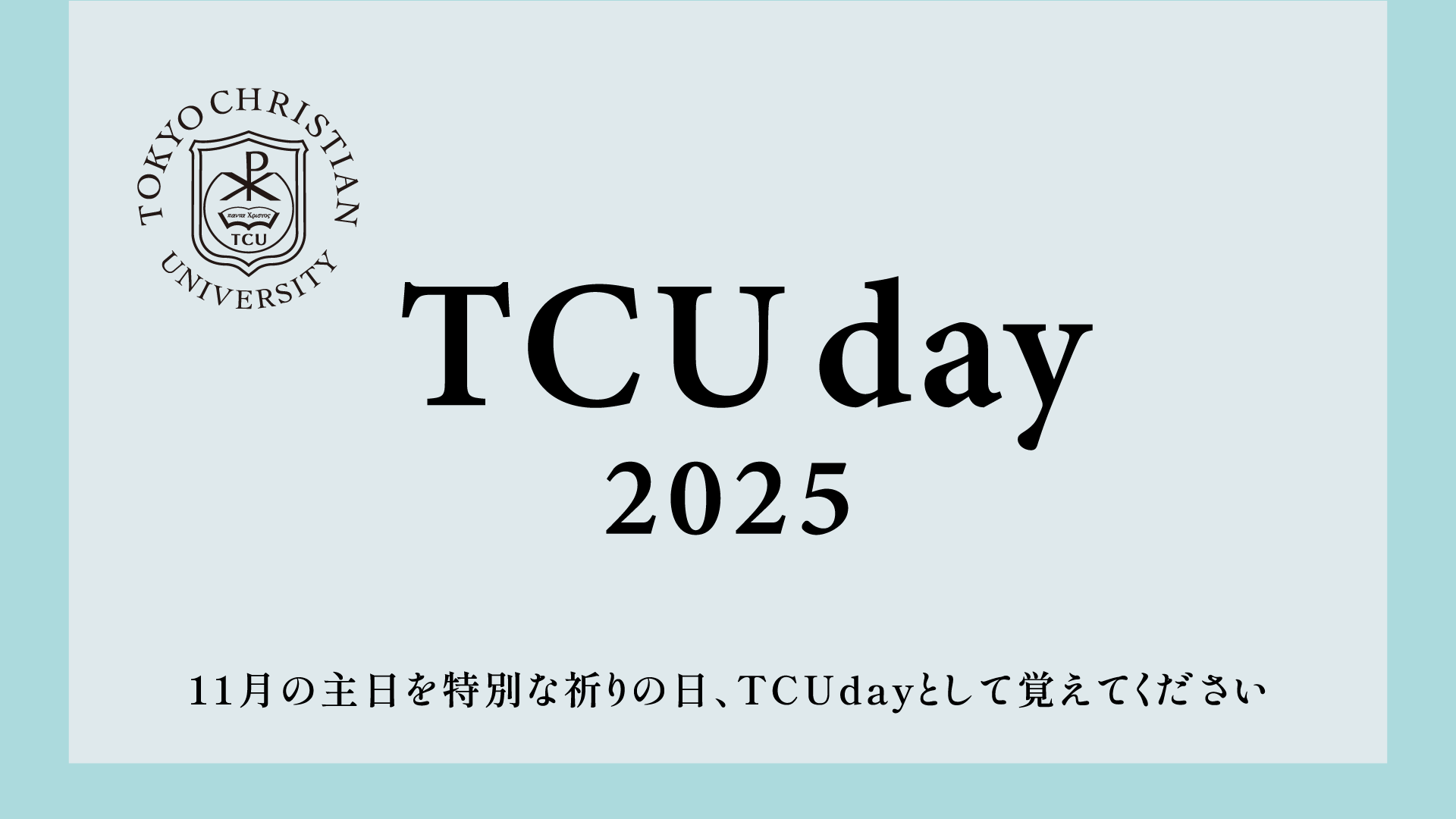 MENU 大学案内 学部・大学院 入学案内 学生生活 国際プログラム 図書館 附属機関 HOME Language English Korean お問い合わせ 受験生サイト 資料請求 支援会/ご寄付(献金) 1年次入学を希望される方へ 学部1年次入学はこちら 編入学を希望される方へ 牧師をめざす方/3年次編入はこちら オンライン教育を希望される方へ TOPICS 東京基督教大学のいまを知る 神学・国際教養学科2025年スタート TCU 公式SNS 学生アンバサダー TCUの1日 科目等履修・聴講プログラム「どこでもTCU」 EVENT TCUday2025 2025/11/1Sat30Sun 11/22オープンキャンパス 2025/11/22Sat イベント一覧 NEWS 2025/11/7 寄附 今月の近況・祈りの課題等 2025/11/7 寄附 寄付金(献金)感謝報告【2025年度11月】 2025/10/10 寄附 今月の近況・祈りの課題等 2025/10/10 寄附 寄付金(献金)感謝報告【2025年度10月】 2025/9/19 広報 どこでもTCU冬学期追加募集 2025/9/12 寄附 今月の近況・祈りの課題等 ニュース一覧 BLOG 東京基督教大学の学生生活を知る 期末突撃インタビュー シオン祭後日談 シオン祭2025 わわわ大会 2025 SPRING RETREAT! 2025 新入生インタビューpart 2 2025 新入生インタビューpart1