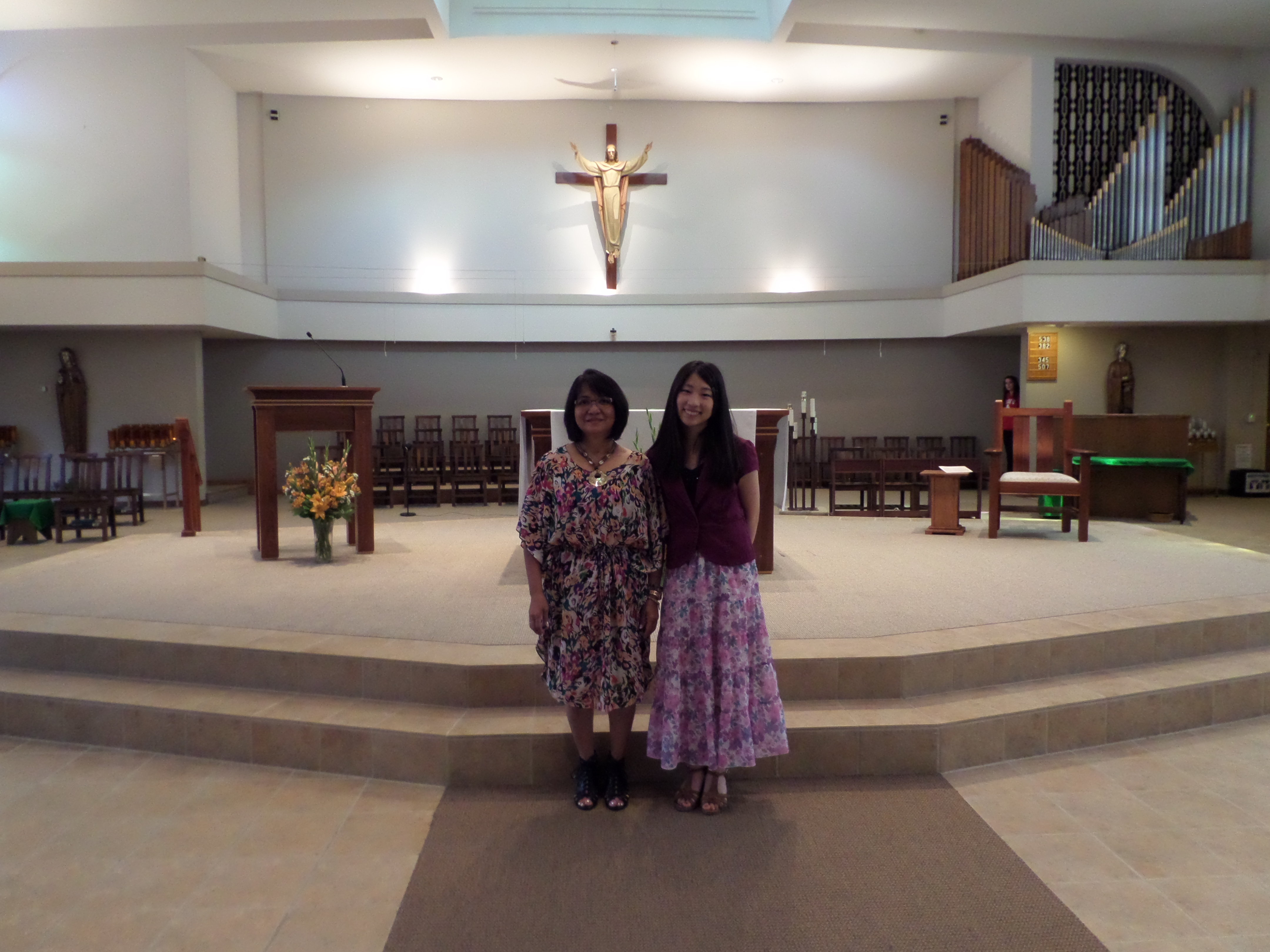 写真は一緒に夜ごはんを食べたときのものと、先週の土曜日に行ったカトリック教会での一枚です。二人ともカトリックの信者で、姪の子供の幼児洗礼式に参加しました。プロテスタントの信者さんのおうちもあるけれども、基本的にはそこまで考えられていな様です。アメリカに来て幼児洗礼式に参加できたのも、ホストファミリーがカトリックだったからで、思いもしなかった経験をたくさんしています。