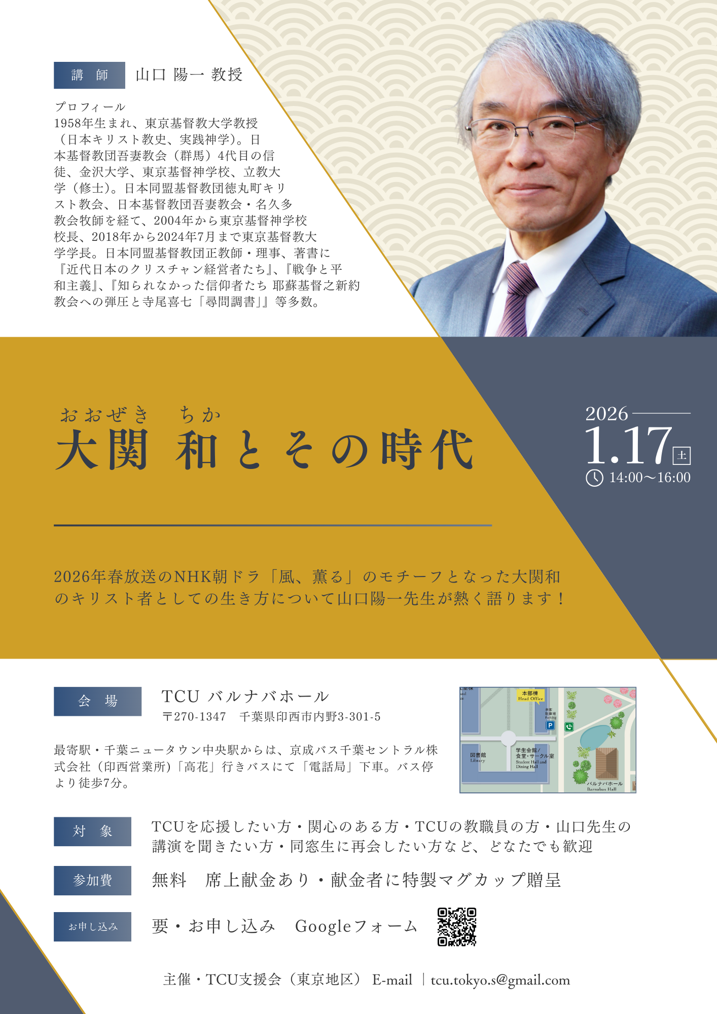 TCUを応援したい方、関心のある方、TCUの教職員の方、山口先生の講演を聞きたい方、同窓生に再会したい方、どなたでも歓迎です。
